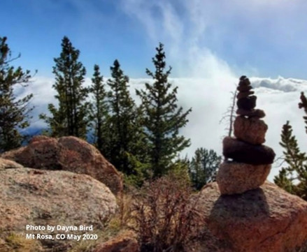 A "cairn" is a pile of rocks and is meant to mark the trail, to guide the hiker and help them find and stay on the path. Often seen while hiking a Colorado Fourteener, we were inspired to use the cairn as a symbol. We also appreciate the following explanation.